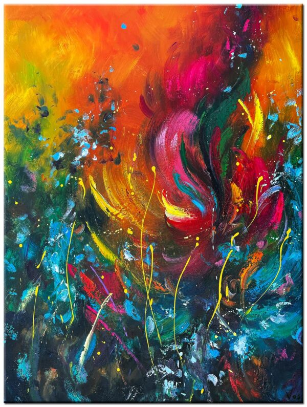 In het midden van het werk ontstaat een abstract bloemmotief dat wordt omringd door beweging en contrast. Felle kleuren zoals rood, oranje en geel worden afgewisseld met diepe blauwen en groentinten. Deze combinatie zorgt voor een dynamisch spanningsveld en geeft het schilderij een krachtige uitstraling zonder zijn balans te verliezen. Door de gelaagde toepassing van olieverf krijgt het oppervlak diepte en karakter.