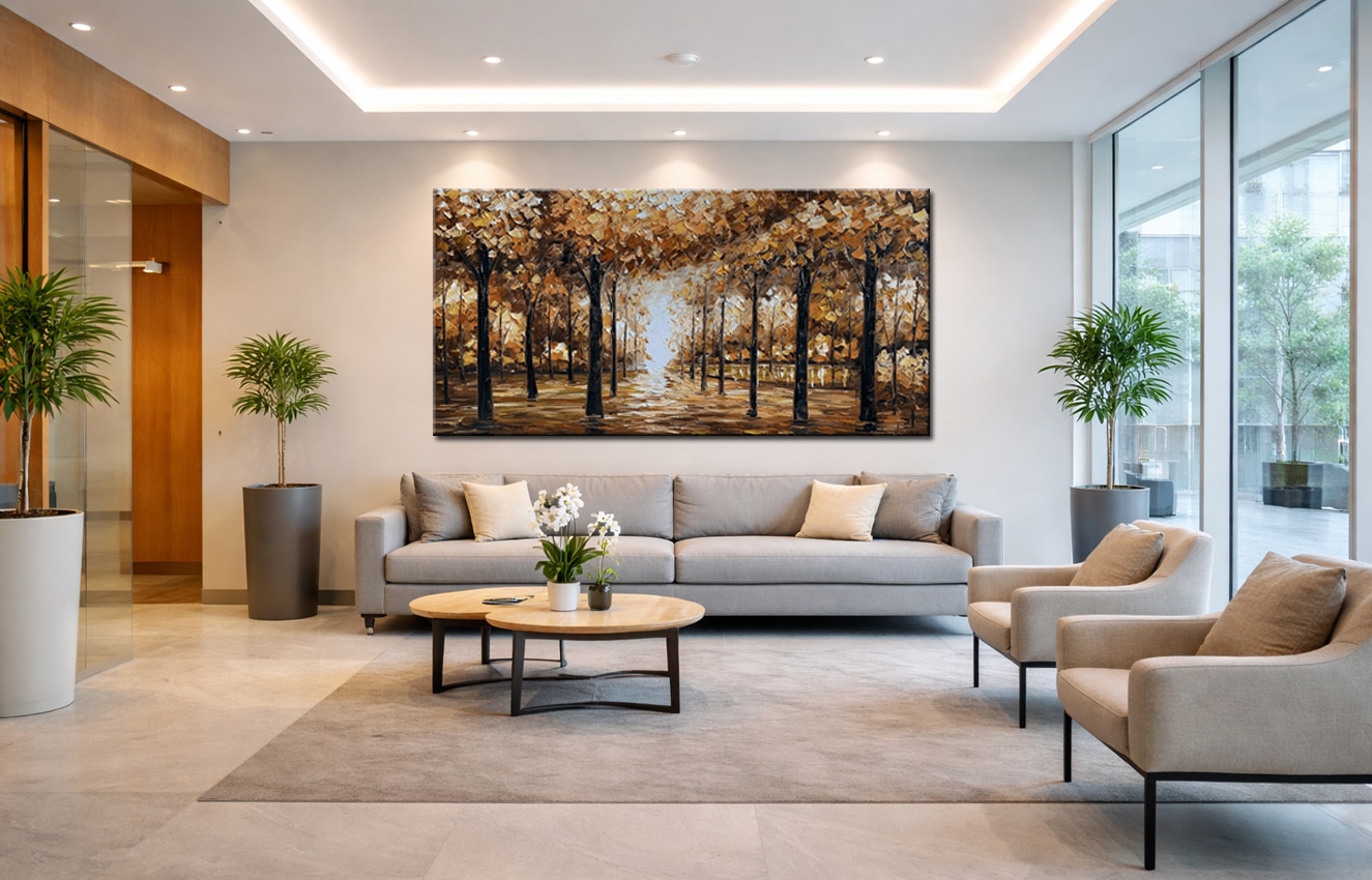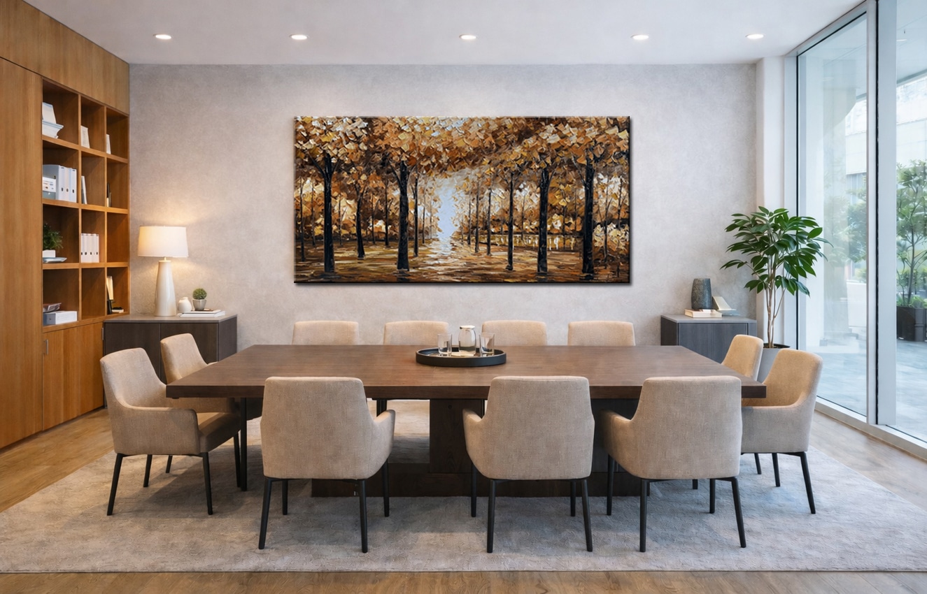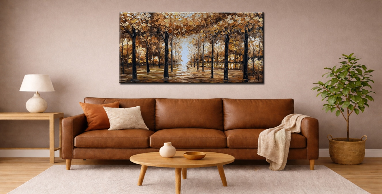 De combinatie van donkere accenten in de stammen en lichte nuances in de achtergrond geeft het werk balans en contrast. Het kleurgebruik sluit aan bij interieurs waarin warmte en rust belangrijk zijn, zoals woonkamers met natuurlijke materialen of zakelijke ruimtes die een rustige uitstraling nodig hebben. Doordat het schilderij horizontaal is opgebouwd, leent het zich bijzonder goed voor plaatsing boven een bank, dressoir of in een ruime hal.