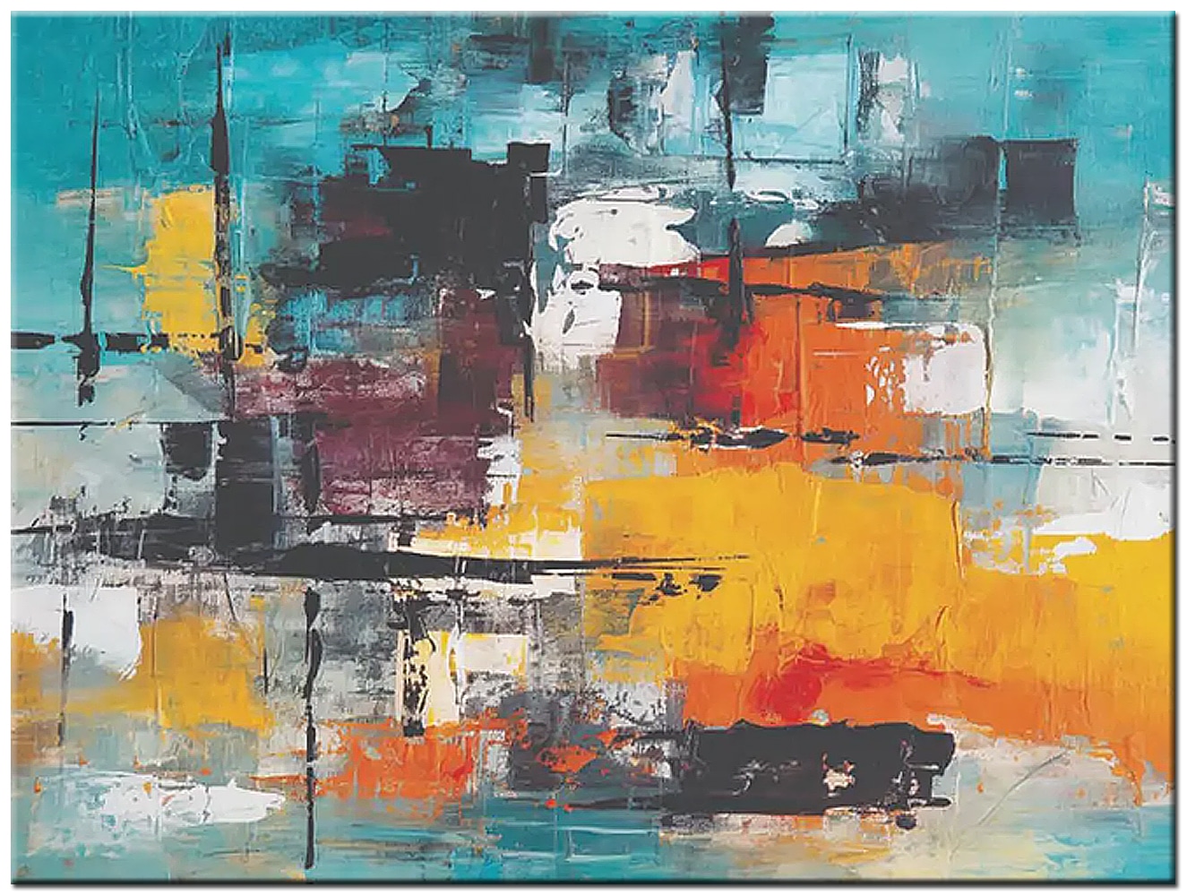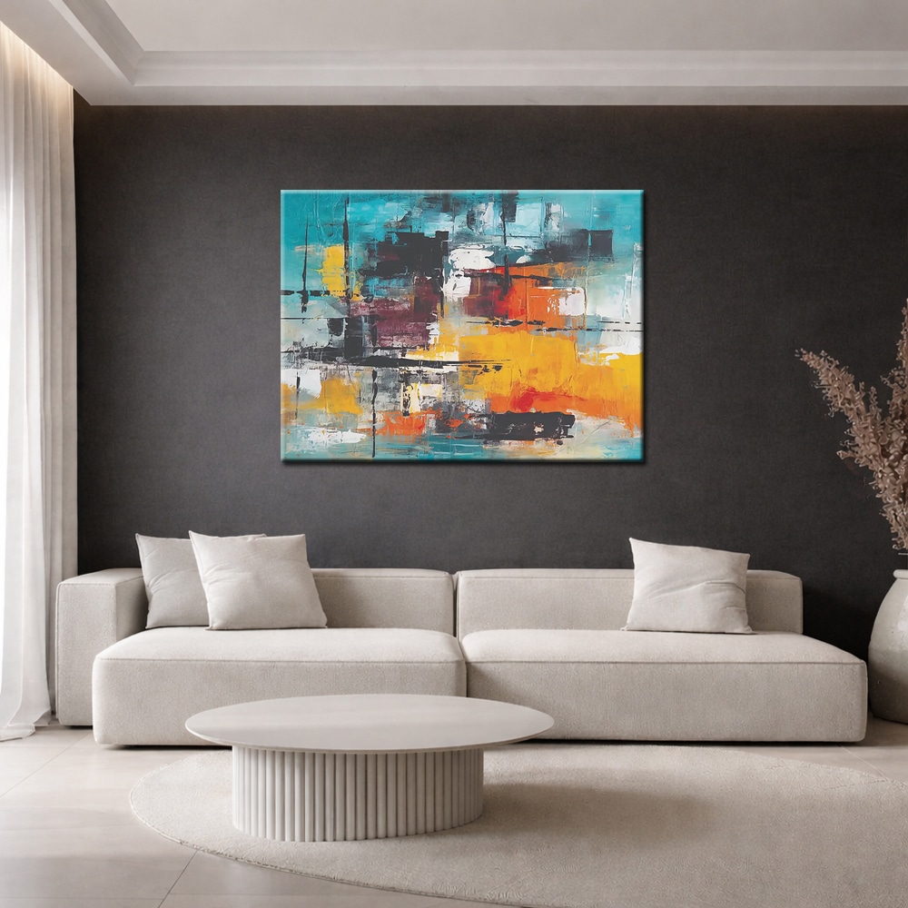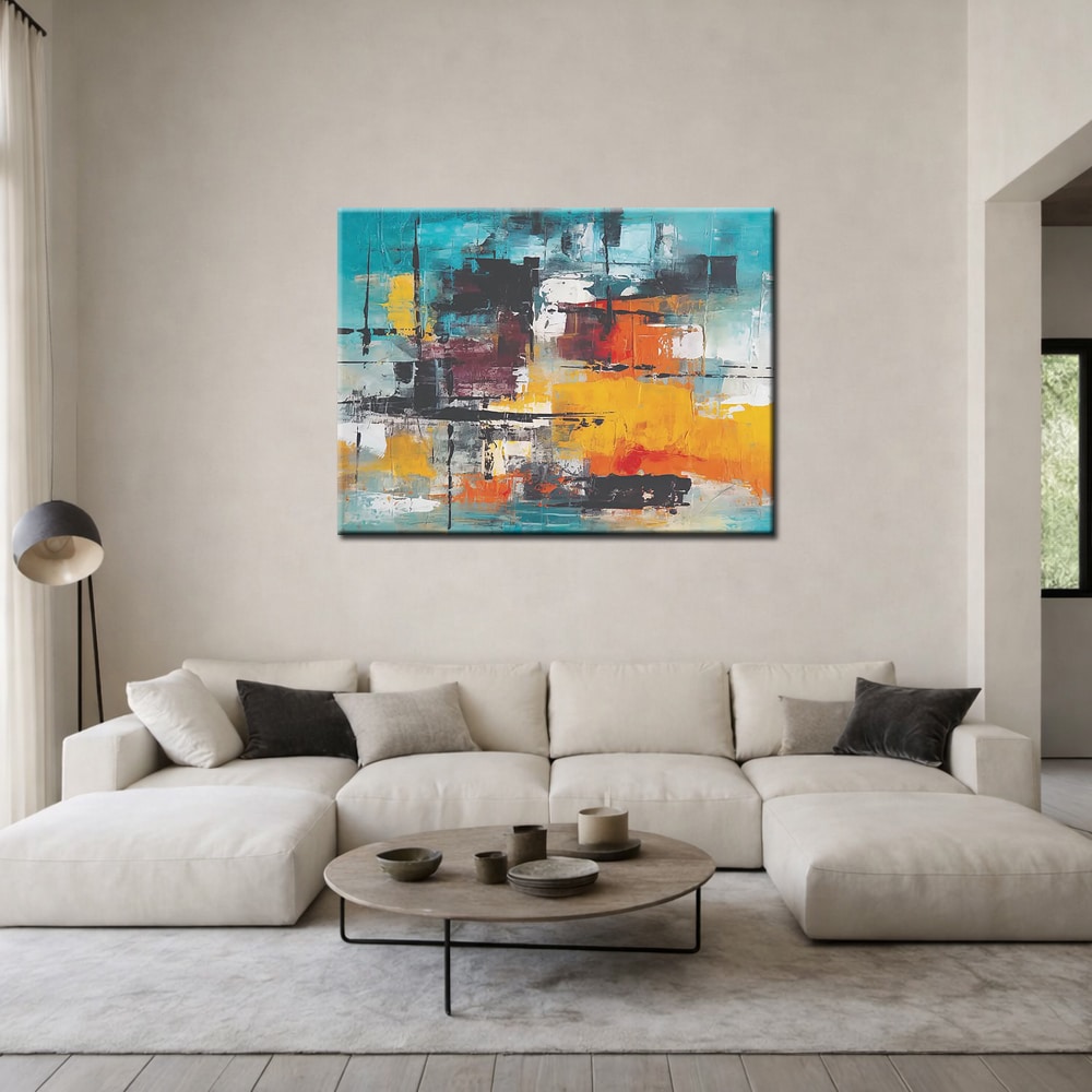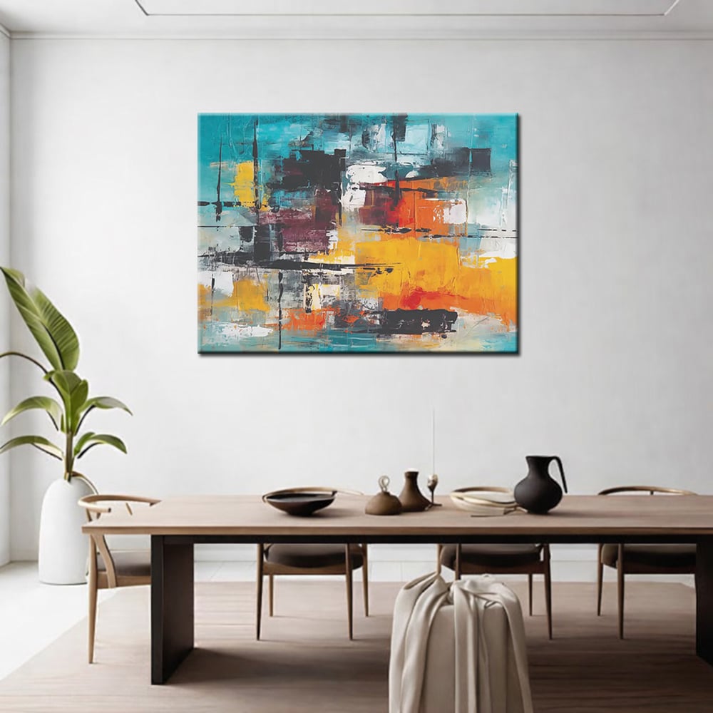 De horizontale opbouw maakt dit schilderij bijzonder geschikt voor een ruime wand, bijvoorbeeld boven een bank of dressoir. De warme geeltonen brengen licht in de ruimte, terwijl het turquoise zorgt voor frisheid en modern karakter. Door de combinatie van warme en koele tinten ontstaat een harmonieus geheel dat zowel krachtig als evenwichtig aanvoelt.