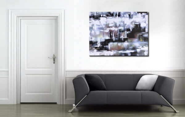 Het abstract schilderij The Stairway is een modern kunstwerk dat de kracht van zwart-wit contrasten combineert met subtiele kleuraccenten. Donkere vlakken en lichte partijen vloeien samen in een dynamische compositie die doet denken aan stedelijke structuren of een trapvormige beweging. De expressieve penseelstreken en gelaagde verfstructuur geven het schilderij diepte en spanning.