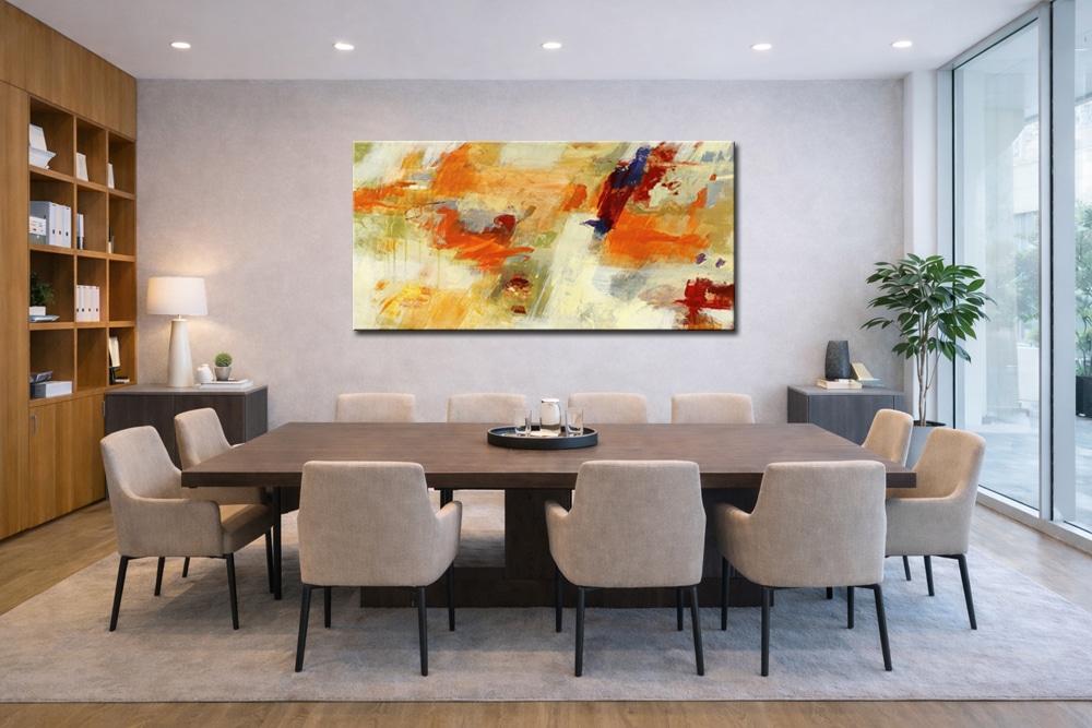 Dit grote abstracte schilderij past uitstekend in moderne woonkamers, open leefruimtes en zakelijke interieurs waar kunst een duidelijke rol speelt in de sfeerbeleving. Boven een bank, in een vergaderruimte of in een ontvangsthal vormt het werk een warm visueel ankerpunt. De liggende oriëntatie versterkt het ruimtelijke effect en sluit mooi aan bij brede wanden.