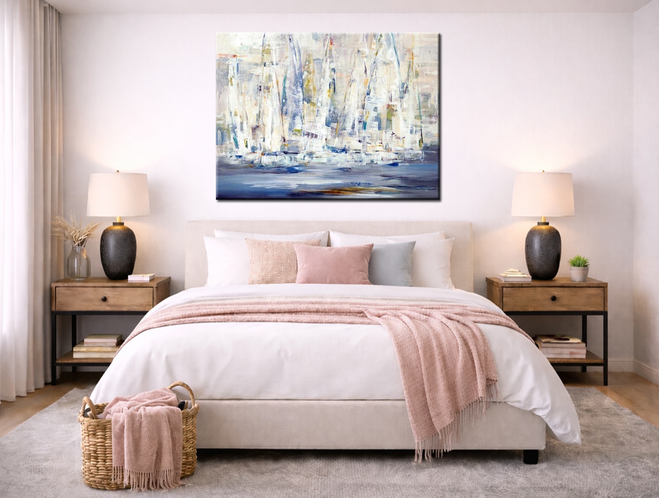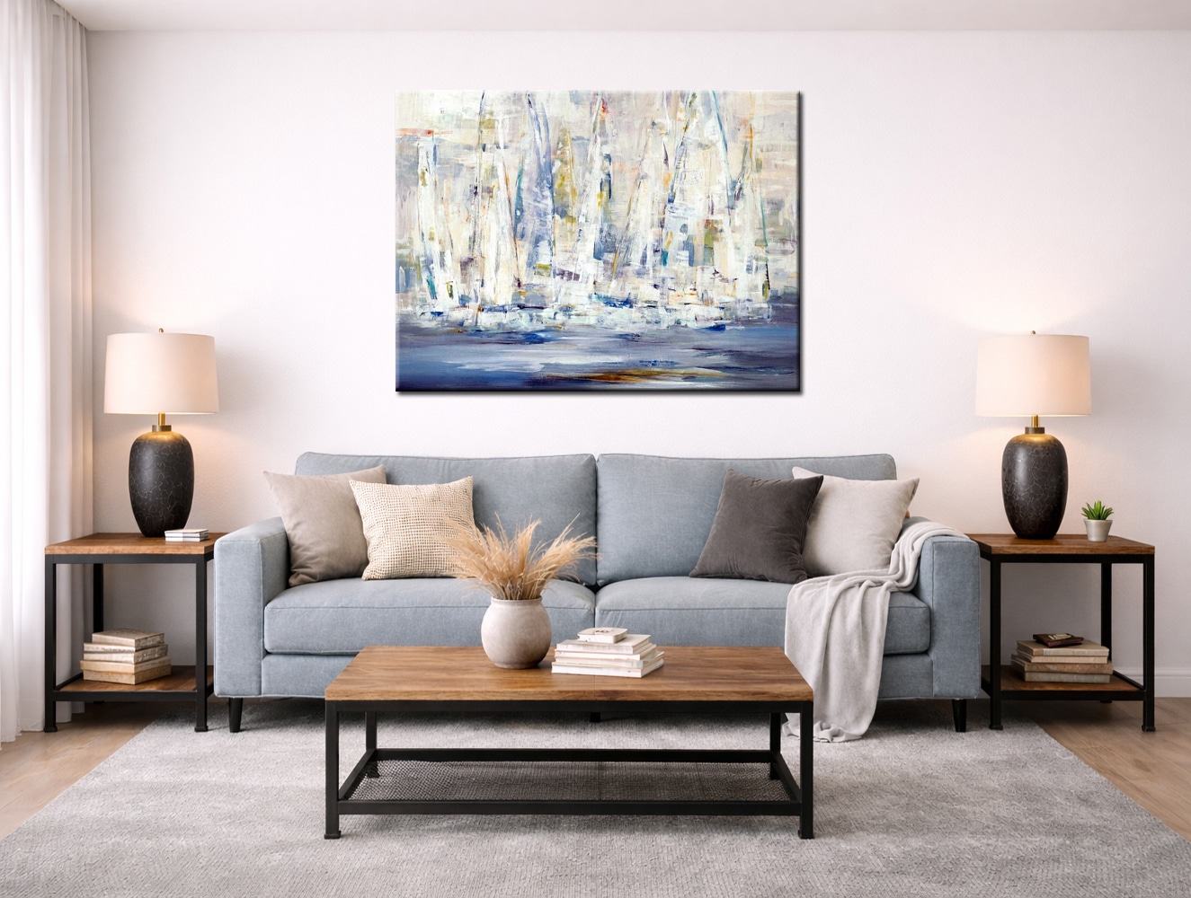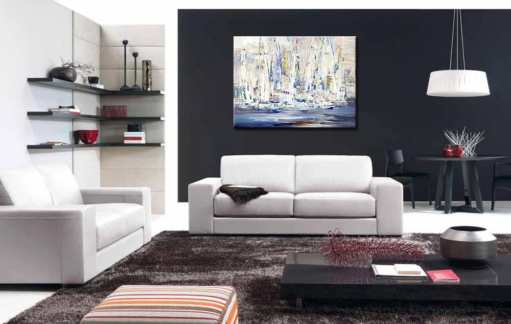 De abstracte benadering van het maritieme thema maakt het werk veelzijdig toepasbaar. De zeilen zijn herkenbaar zonder letterlijk te worden uitgewerkt, wat zorgt voor een tijdloze uitstraling. Het kleurgebruik sluit mooi aan bij interieurs waarin lichte materialen, ruimte en eenvoud belangrijk zijn.