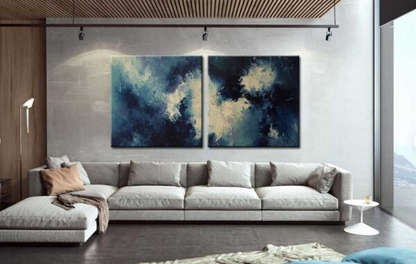Dankzij het gebruik van verschillende blauwtinten heeft het schilderij een verkoelende, rustgevende werking. De beide panelen kunnen met een kleine tussenruimte worden opgehangen, wat een gevoel van beweging en ruimte creëert. Het werk past perfect boven een bank, bed of lange wand en brengt elegantie en balans in de kamer.