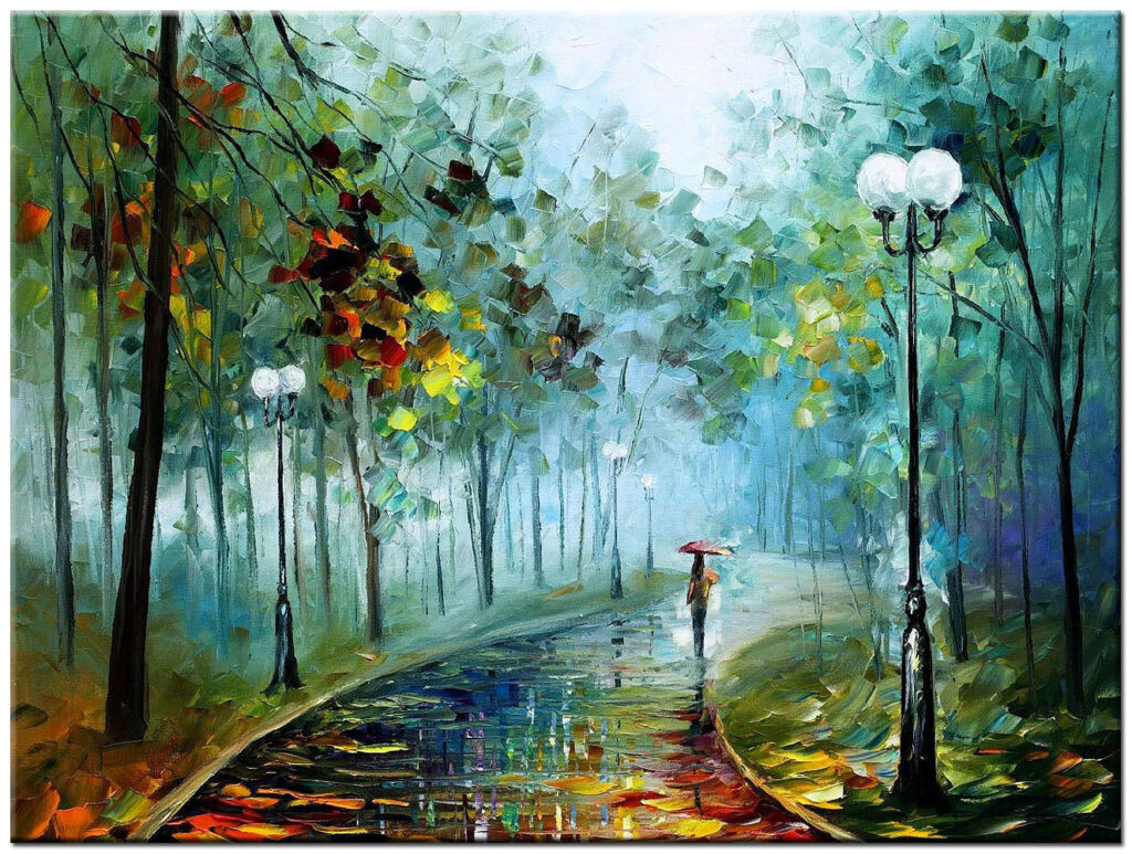 Avond Wandeling modern schilderij vangt het rustige moment van een wandeling door het park. Dit sfeervolle kunstwerk is een ode aan stilte, reflectie en de warme gloed van de avond. De kleuren lopen subtiel over van grijs naar rood en blauw, wat zorgt voor een intieme en harmonieuze uitstraling.