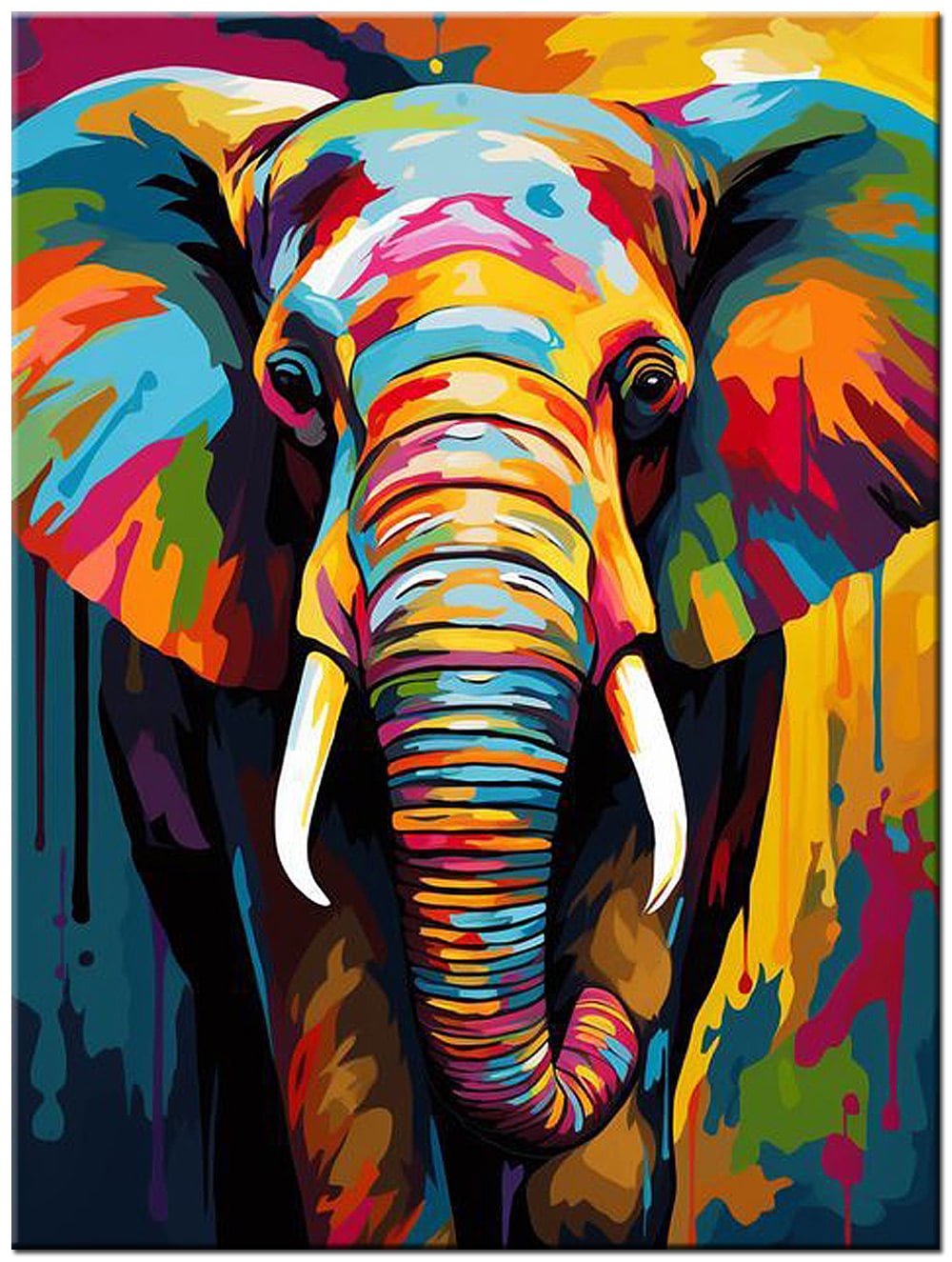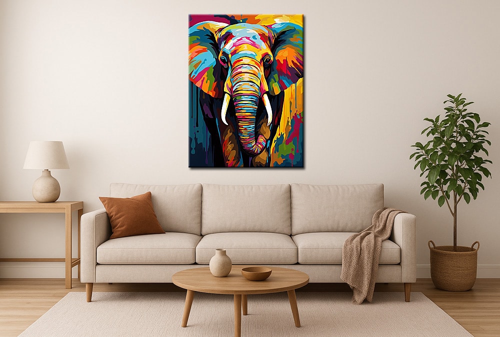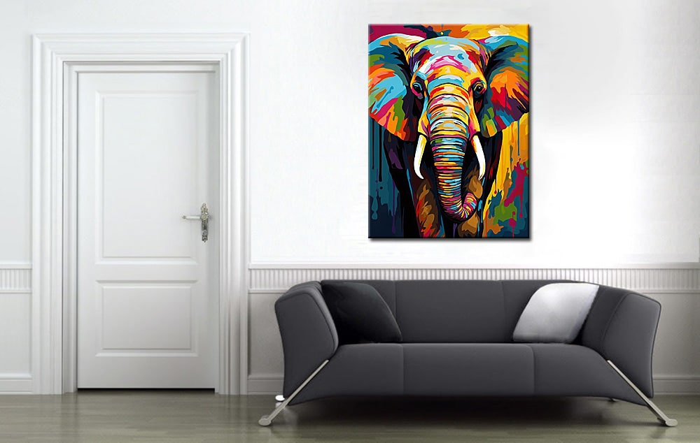 De olifant is met veel detail uitgewerkt, van de textuur in de slurf tot de lichte accenten op de slagtanden. In het midden van het doek komt Dieren schilderij Kleurrijke Olifant volledig tot zijn recht doordat de kleuren vloeiend in elkaar overlopen en een sterk dieptegevoel creëren. Het spel tussen donkere en heldere vlakken geeft het schilderij een moderne uitstraling, terwijl het dier zijn herkenbare vorm behoudt.