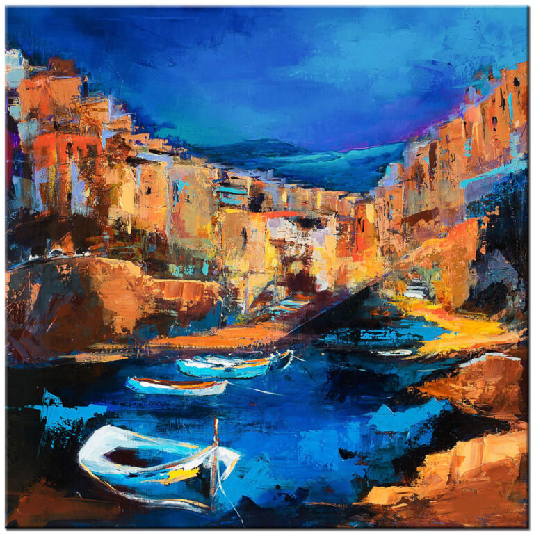 Abstract schilderij Kleurrijke Havenstad brengt de sfeer van een levendige kustplaats tot leven in een krachtig vierkant formaat. Warme tinten oranje, rood en geel vormen een prachtig contrast met de diepe blauwen van lucht en water. Dit handgeschilderd olieverf schilderij straalt energie uit en trekt direct de aandacht door de rijke kleurcombinaties en zichtbare penseelstreken.