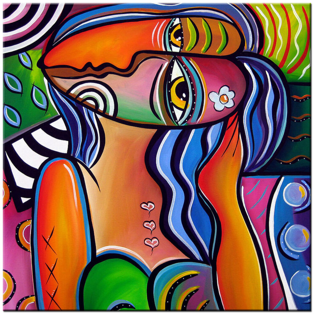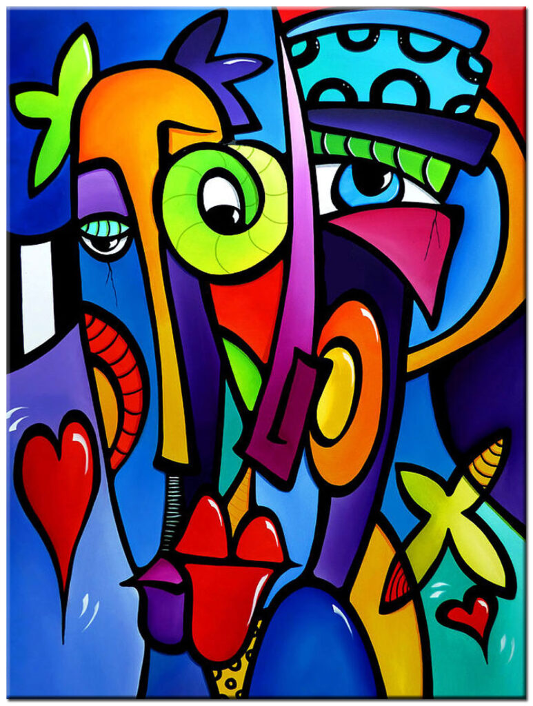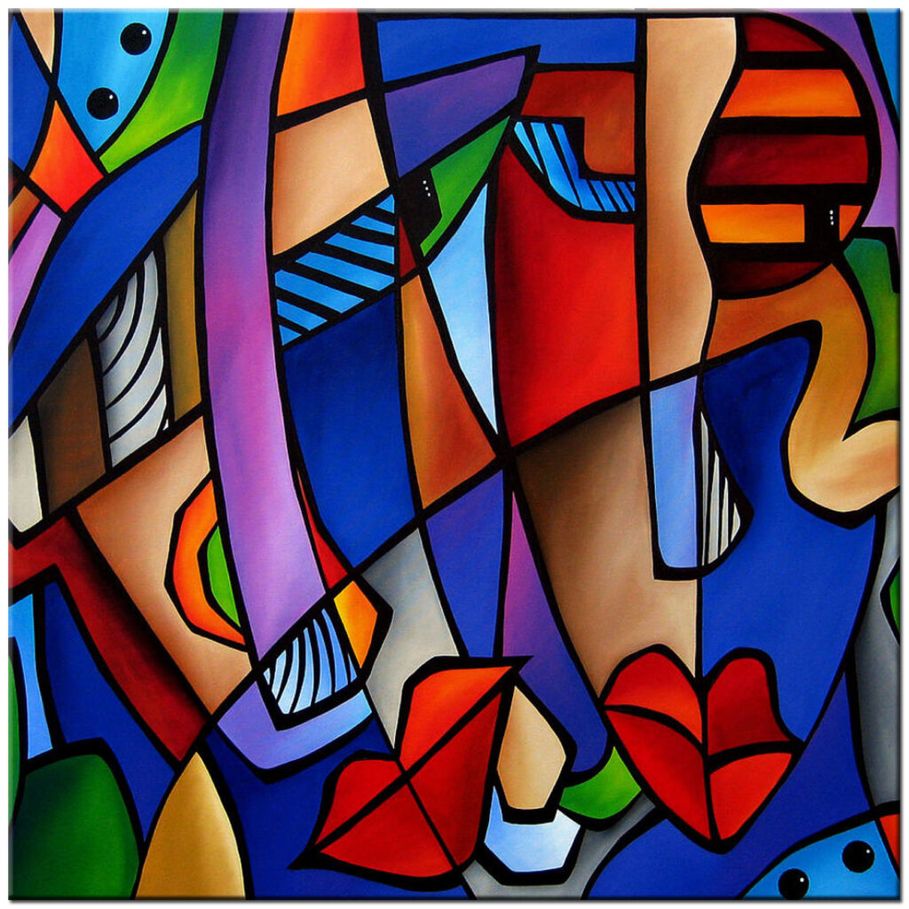 De felle kleurcontrasten van blauw, groen, geel en roze versterken de emotie en energie van het werk. Door de dynamische compositie lijkt het alsof de figuren in beweging zijn en versmelten tot één geheel. Deze manier van schilderen past perfect bij de kubistische kunst, waarbij herkenbare vormen worden vervormd en vanuit meerdere invalshoeken tegelijk zichtbaar zijn. Het resultaat is een schilderij dat zowel sensueel als artistiek uitdagend is.
