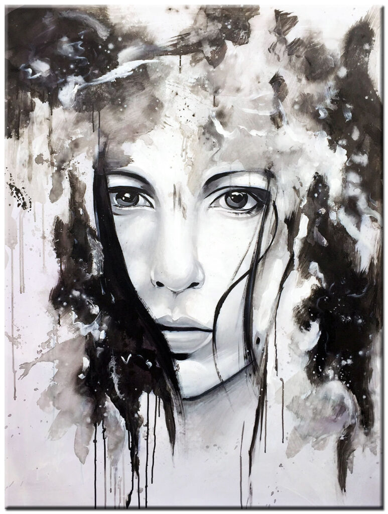 Het gebruik van olieverf zorgt voor rijke kleurnuances in de grijstinten en geeft het werk extra diepte. Elke penseelstreek draagt bij aan de expressieve uitstraling, waardoor dit schilderij telkens opnieuw weet te boeien.