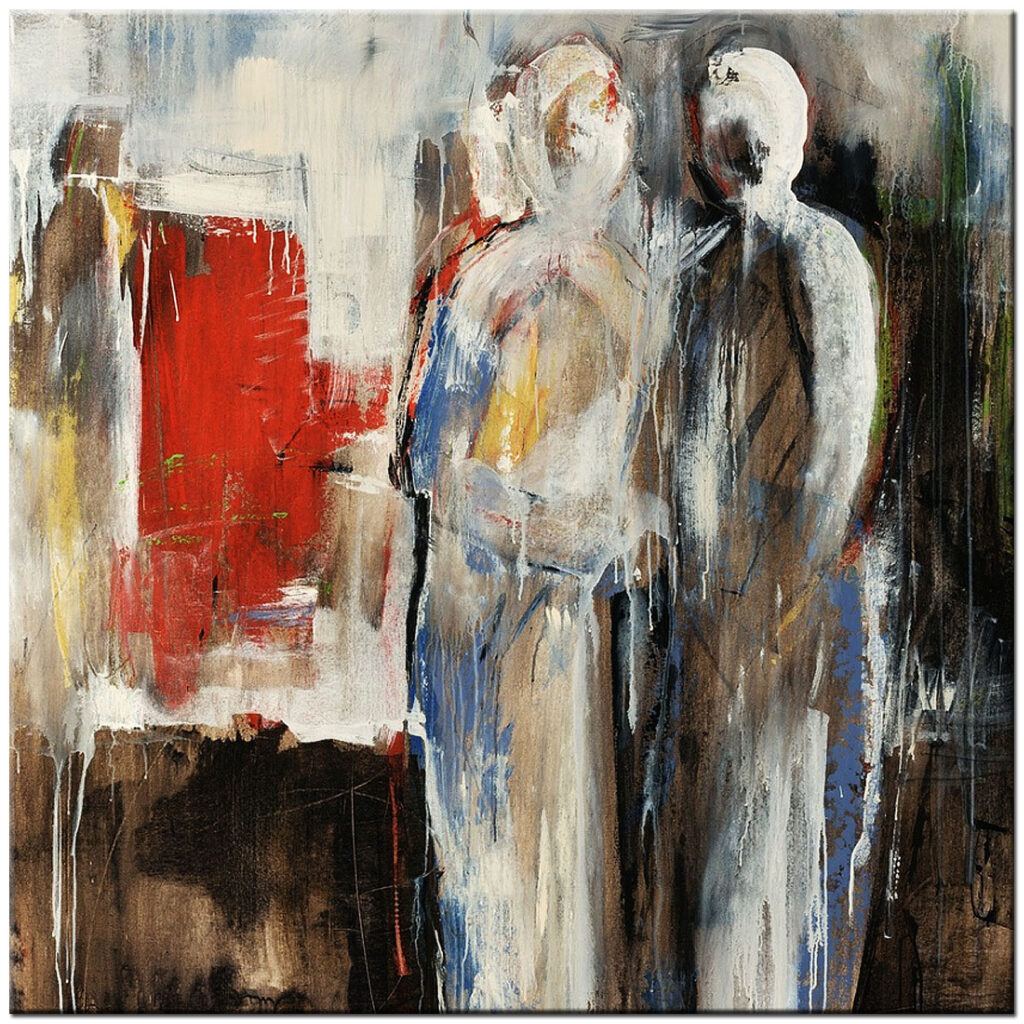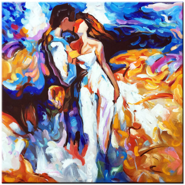 Liefde in de Storm modern schilderij vangt een intiem moment van liefde te midden van een woelige omgeving. Een verliefd stel kust elkaar in de regen terwijl de wind en kleuren om hen heen dansen. De compositie straalt emotie uit en is geschilderd in een figuratieve stijl, met levendige tinten bruin, blauw en wit die het werk energie geven.