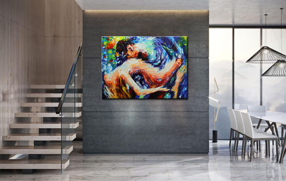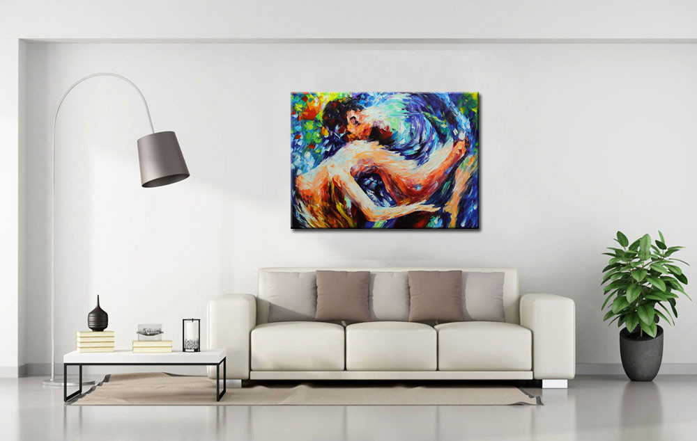 Making Love erotisch modern schilderij is een krachtig en intiem kunstwerk dat liefde en passie op subtiele wijze verbeeldt. In warme tinten en met expressieve penseelvoering laat de kunstenaar twee lichamen samensmelten in een moment van verbondenheid. Het schilderij is volledig met de hand geschilderd met olieverf op canvas, geen druk of print!