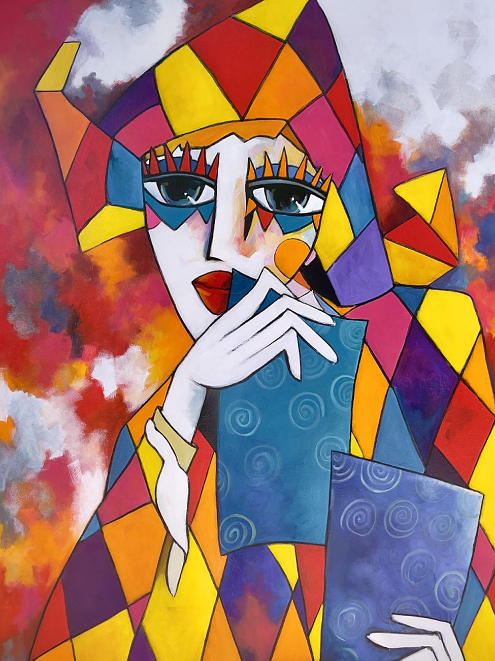 Naarmate je langer kijkt, ontstaat er een spel tussen rol en identiteit. Het maskerachtige karakter van het gezicht en de gelaagde opbouw van vormen maken het werk interpretatief en gelaagd. De compositie blijft in balans door de heldere lijnen en het harmonieuze kleurgebruik, waardoor het schilderij toegankelijk blijft ondanks zijn uitgesproken karakter.