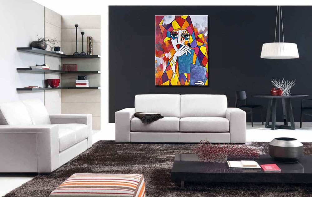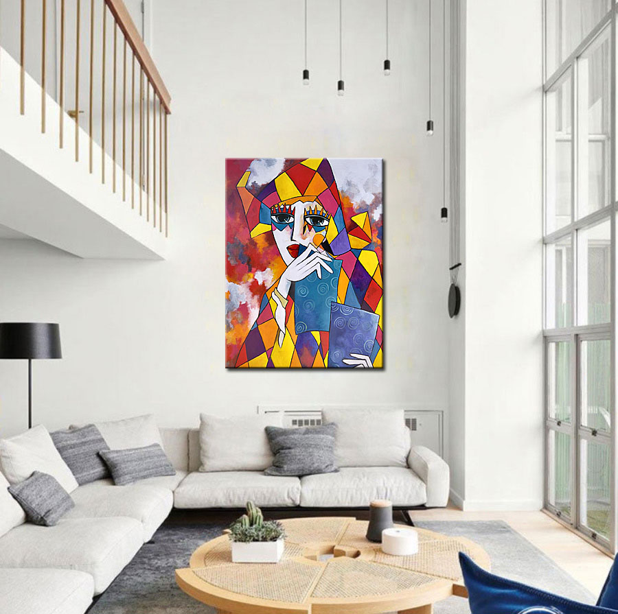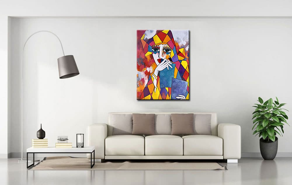 Dankzij de staande oriëntatie en het krachtige kleurenspel komt Modern schilderij Harlekijn Dame bijzonder goed tot zijn recht op een prominente wand. Het schilderij trekt aandacht, maar behoudt zijn verfijning door de balans tussen figuratie en abstractie. Zo blijft Modern schilderij Harlekijn Dame een intrigerend en blijvend onderdeel van het interieur.