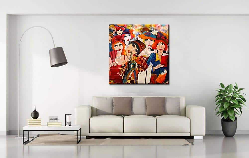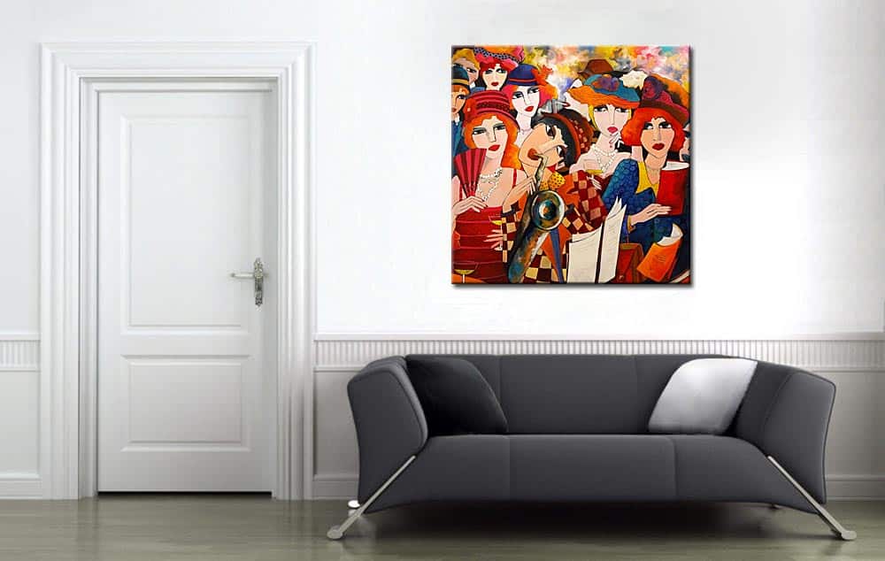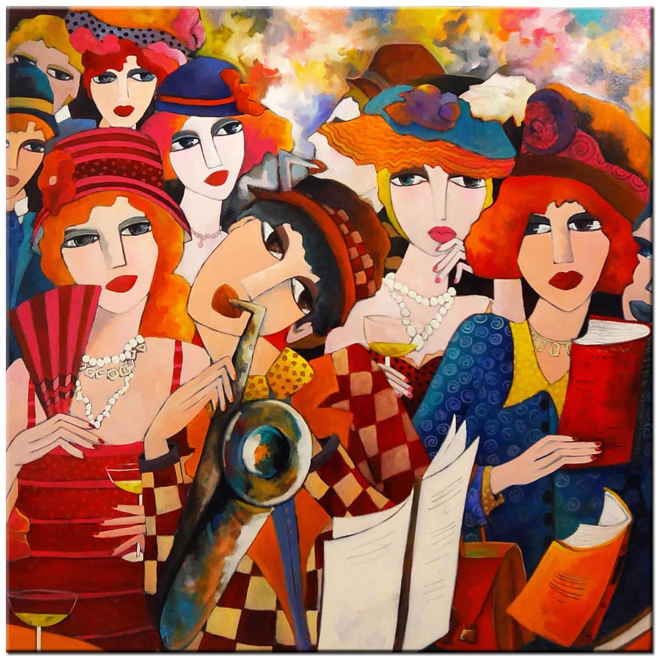 Modern schilderij Jazz Vrouwen toont een levendig en kleurrijk tafereel waarin muziek, gezelschap en elegantie samenkomen. Meerdere vrouwen zijn afgebeeld in een sfeervolle setting waarin jazzmuziek duidelijk voelbaar is. De combinatie van figuren, accessoires en muzikale elementen zorgt voor een dynamisch beeld dat direct de aandacht trekt.