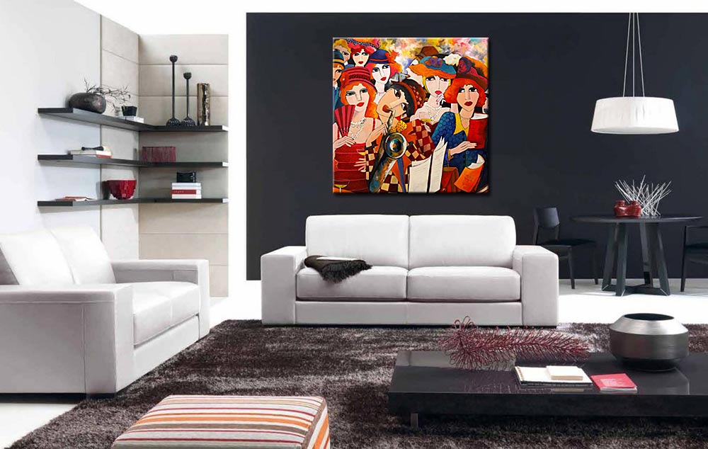 Voor liefhebbers van muziek schilderijen en figuratieve kunst vormt dit schilderij een expressieve toevoeging. Modern schilderij Jazz Vrouwen brengt stijl, gezelligheid en muzikale sfeer samen in één krachtig kunstwerk.