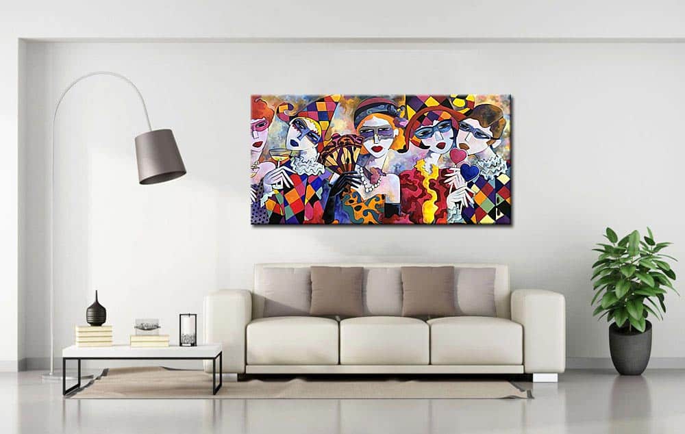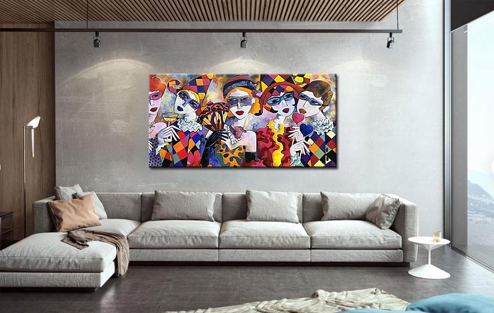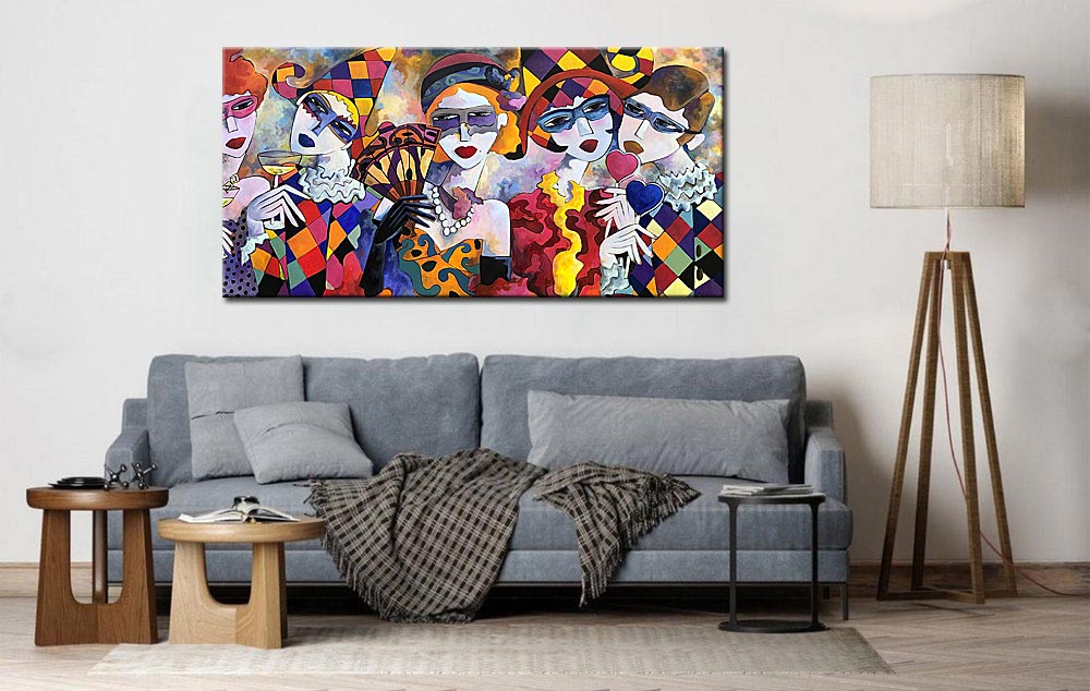 Dankzij het brede formaat en de rijke compositie komt het Modern schilderij Maskerade bijzonder goed tot zijn recht boven een bank of grote wand. Het schilderij brengt energie in de ruimte en nodigt uit tot kijken, ontdekken en interpreteren. Door de combinatie van figuratie, kleur en olieverf blijft Modern schilderij Maskerade een krachtig onderdeel van het interieur.