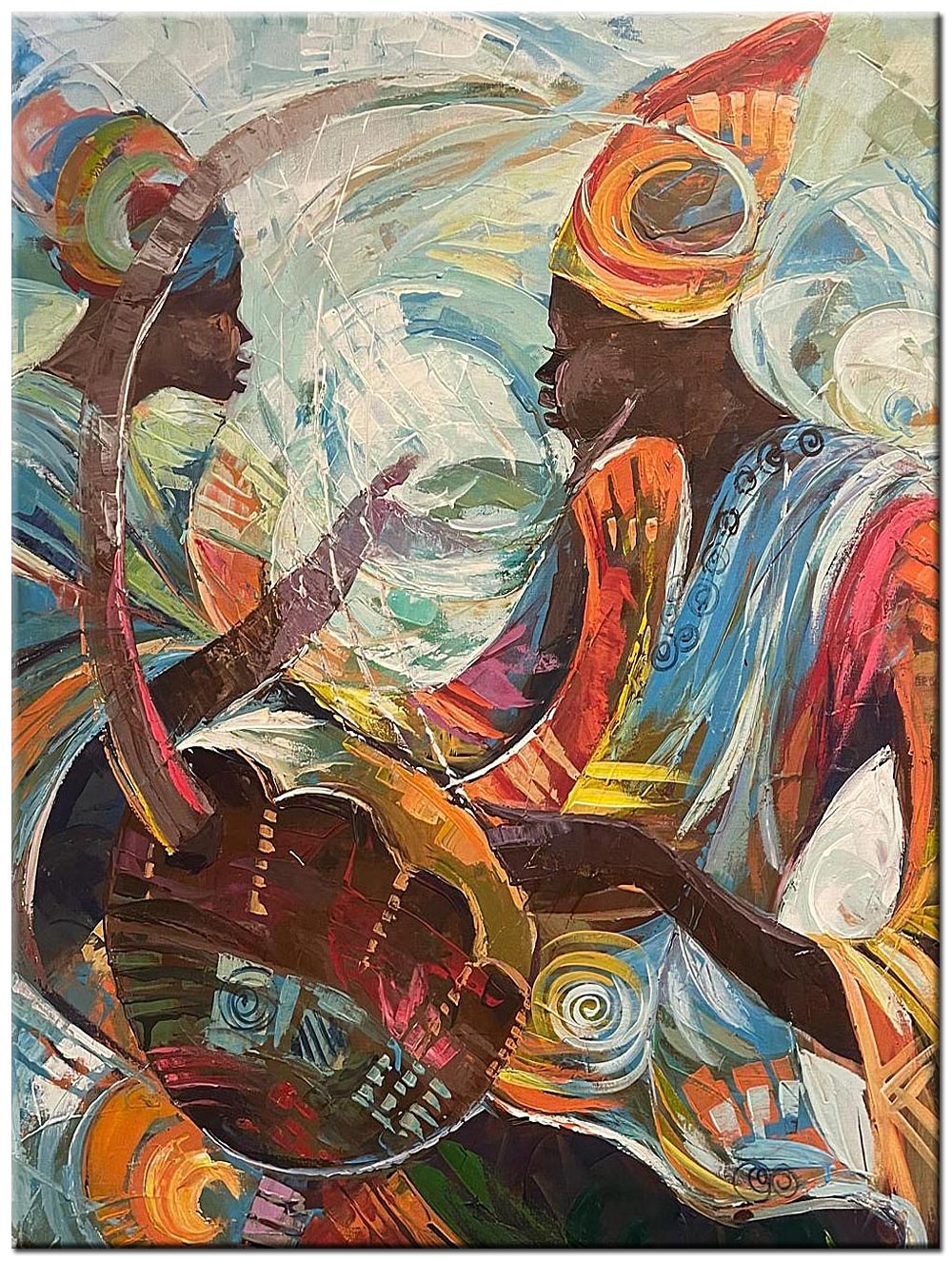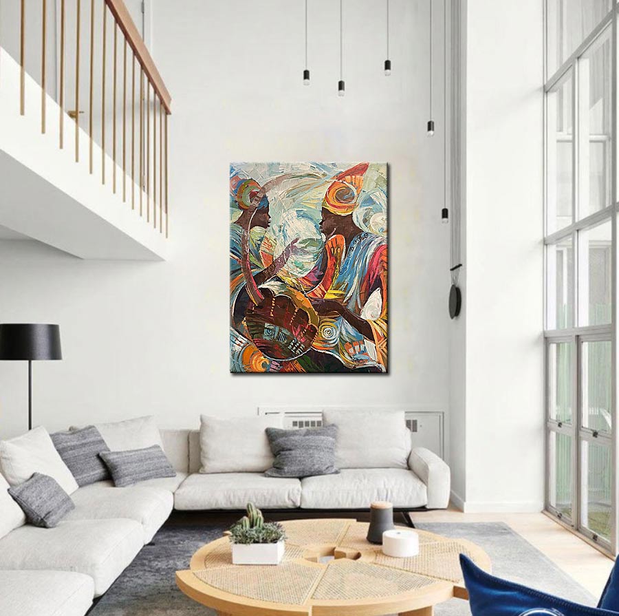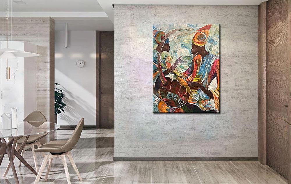 Dankzij het staande formaat en het rijke kleurgebruik komt het Modern schilderij Ritme van Ontmoeting bijzonder goed tot zijn recht op een prominente wand in de woonkamer of een open leefruimte. Het schilderij nodigt uit tot kijken en blijft boeien door de combinatie van figuratieve elementen, kleurbeweging en een subtiele muzikale lading. Zo brengt Modern schilderij Ritme van Ontmoeting niet alleen beeld, maar ook gevoel en ritme in het interieur.