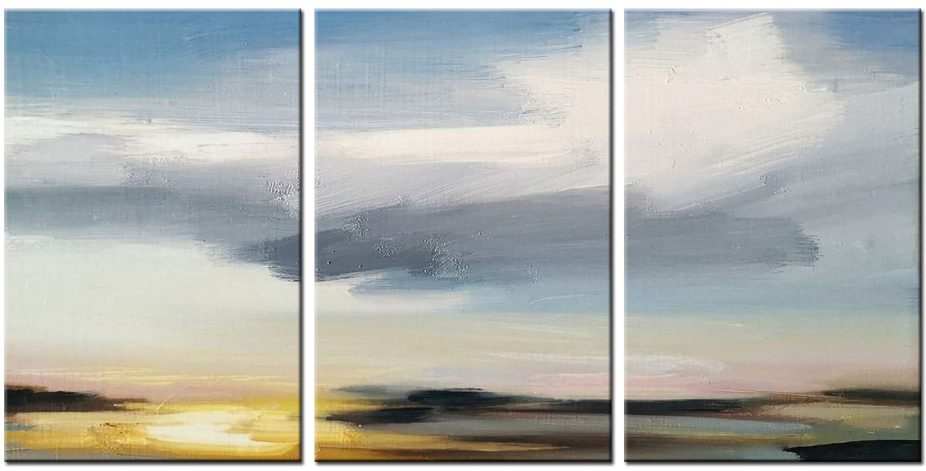 De abstracte horizonlijnen suggereren landschap en lucht zonder deze letterlijk weer te geven. Hierdoor blijft het schilderij open voor interpretatie en past het moeiteloos in verschillende interieurstijlen. Licht en kleur lopen geleidelijk in elkaar over, wat het werk een serene en tijdloze uitstraling geeft. De drie panelen vullen elkaar aan zonder dat één deel overheerst.