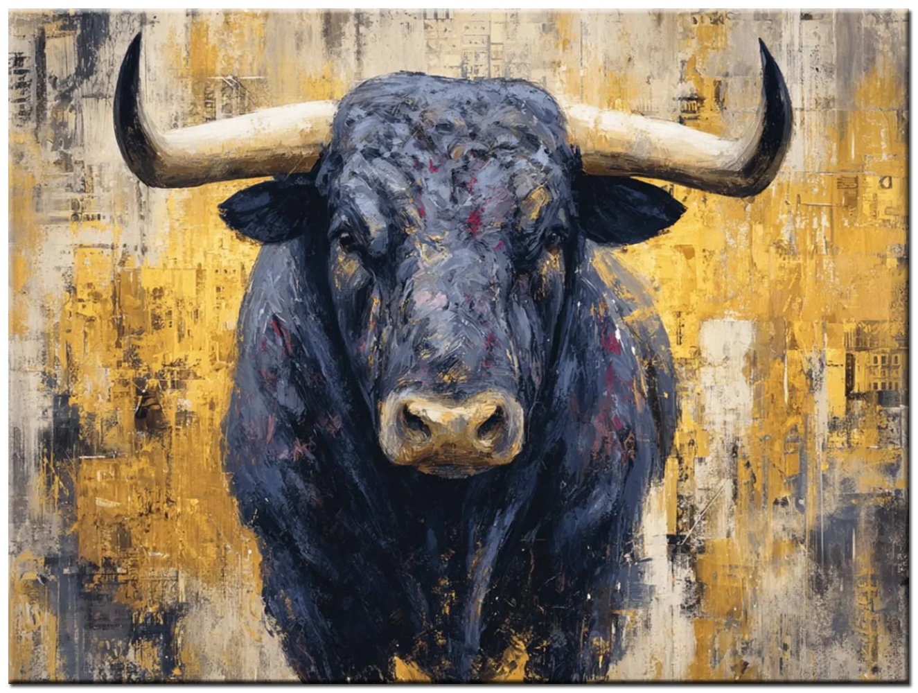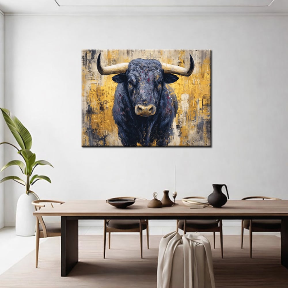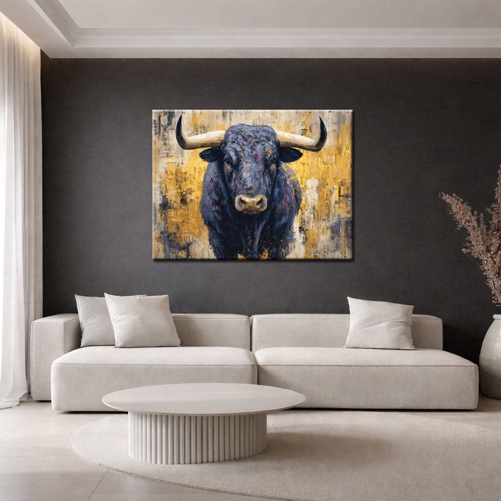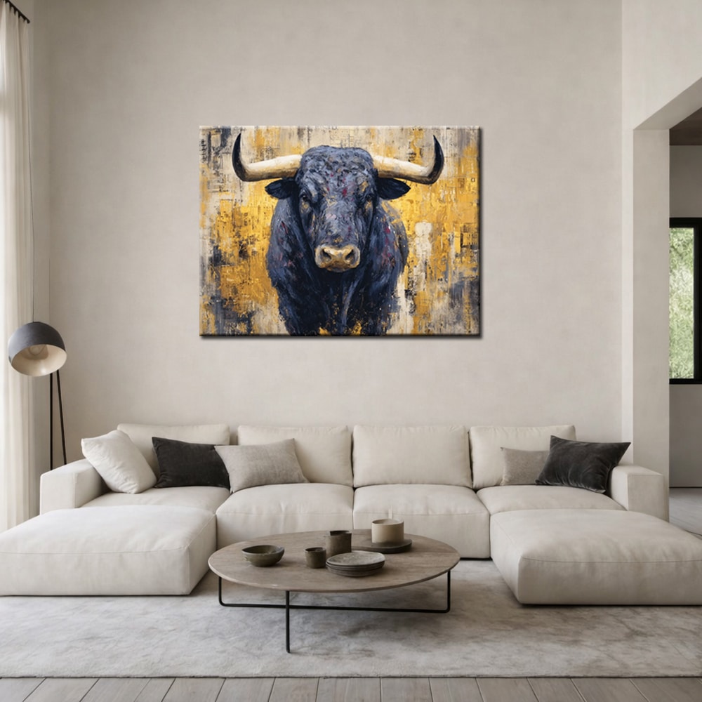 Modern schilderij Zwarte Stier op Goud is een krachtig statement voor wie durft te kiezen voor karakter aan de muur. De imposante stier is frontaal afgebeeld en kijkt recht vooruit, wat direct een gevoel van vastberadenheid en controle oproept. De diepe zwart- en antraciettinten van het dier vormen een sterk contrast met de warme goud- en okerkleuren op de achtergrond.