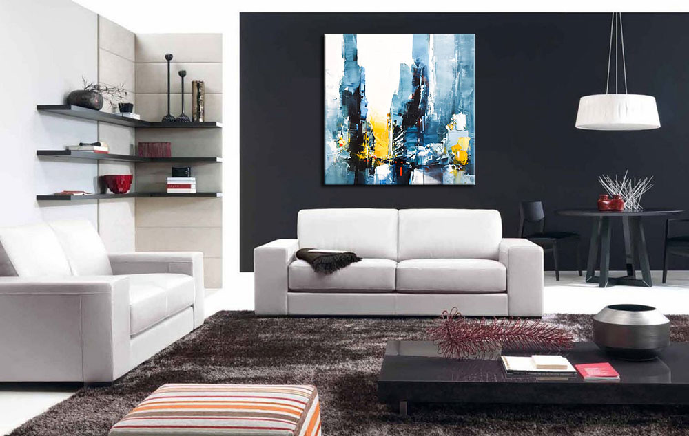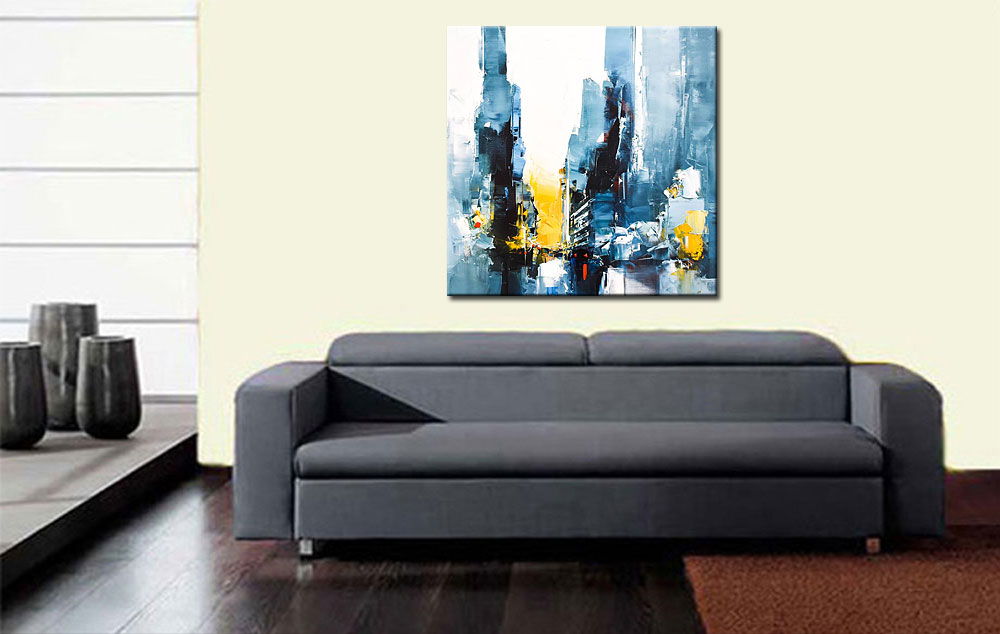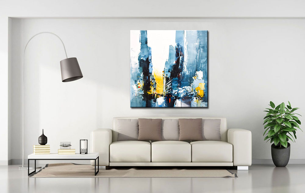 De zijkanten zijn meegeschilderd, zodat het schilderij direct klaar is om op te hangen zonder lijst. Het moderne stadsgezicht past perfect in een lichte, stijlvolle woonkamer, kantoor of hal.