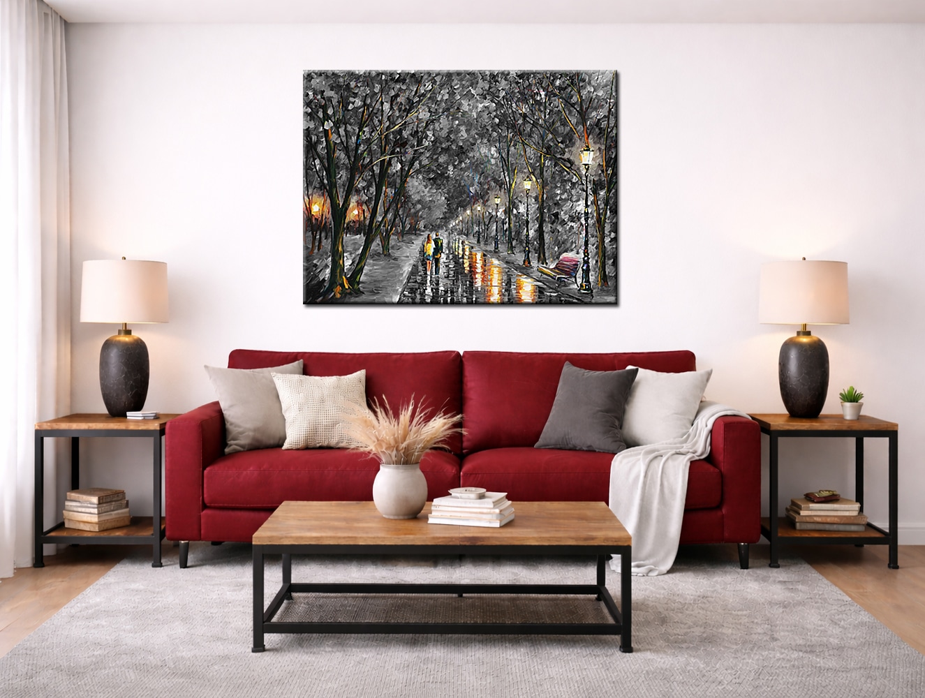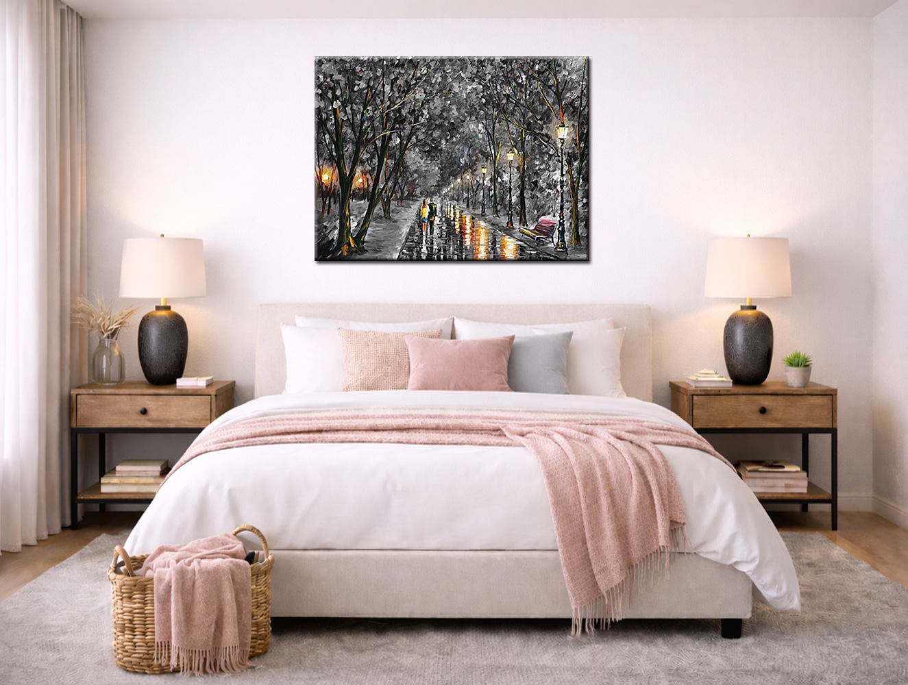 Parkwandeling bij nacht modern schilderij brengt de serene sfeer van een avondwandeling tot leven. De zachte gloed van lantaarns reflecteert op natte paden, terwijl bomen in zwart/wit de nachtelijke scène omlijsten. Het schilderij ademt romantiek en rust, perfect voor wie houdt van sfeer en emotie aan de muur.