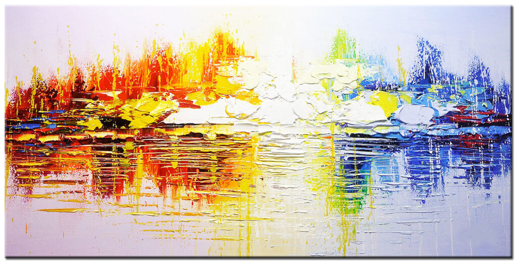Abstract schilderij Zonsondergang in kleur is een explosie van warmte, energie en beweging. Het doek vangt het magische moment waarop de zon laag aan de hemel staat en de lucht verandert in een weelderig palet van goudgeel, oranje, rood en contrasterende koele tinten. Met dikke lagen verf en een levendige textuur lijkt het oppervlak bijna te gloeien, waardoor het schilderij diepte en dynamiek krijgt. De subtiele reflecties in het onderste deel geven het gevoel dat je uitkijkt over een kalm wateroppervlak waarin het kleurenfeest wordt weerspiegeld.