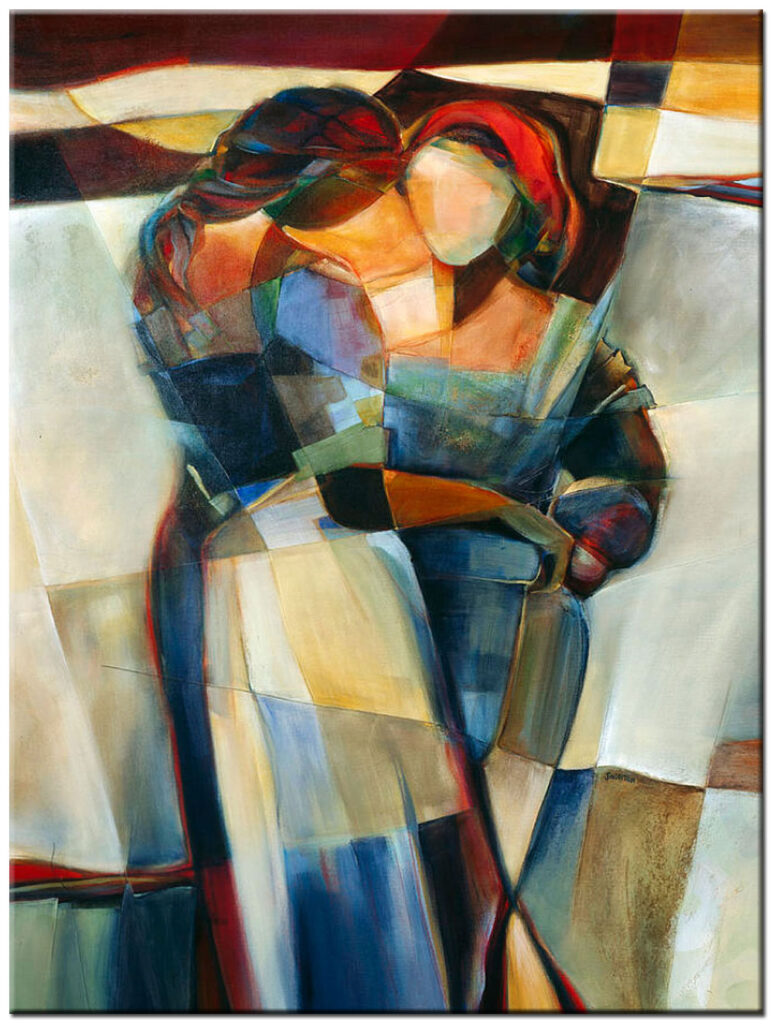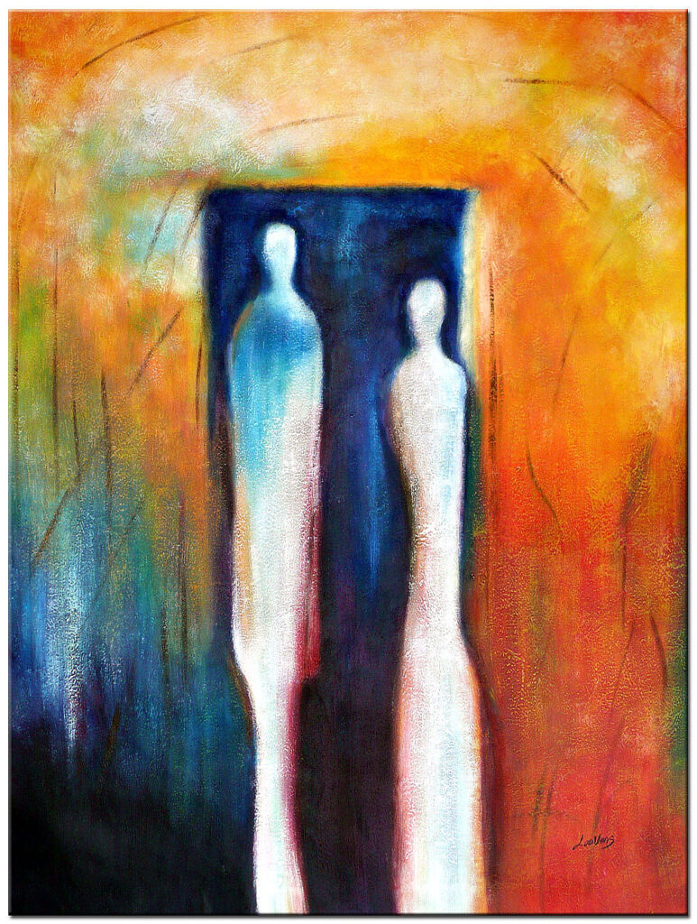 Samenkomst modern schilderij toont een krachtig en ingetogen moment van mensen die elkaar ontmoeten, afgebeeld als gestileerde silhouetten tegen een sfeervolle achtergrond. De eenvoud van de vormen en het subtiele kleurgebruik zorgen voor een moderne uitstraling met diepgang. Dit schilderij spreekt tot de verbeelding en laat ruimte voor interpretatie, ideaal voor wie van symboliek en rust in kunst houdt.
