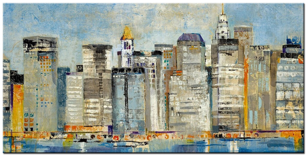 Skyline Contrast modern schilderij is een krachtig en dynamisch stadsgezicht waarin licht en donker elkaar ontmoeten. De skyline wordt neergezet met opvallende contrasten in kleur en vorm, wat zorgt voor een moderne, abstracte uitstraling. Ideaal voor wie van stedelijke kunst met karakter houdt.