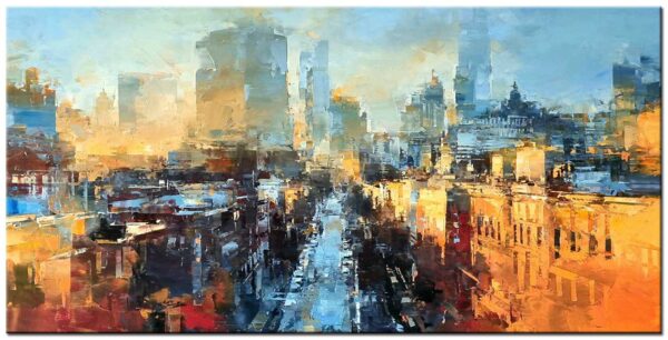 Stad modern groot schilderij. Met de hand geschilderd met olieverf.