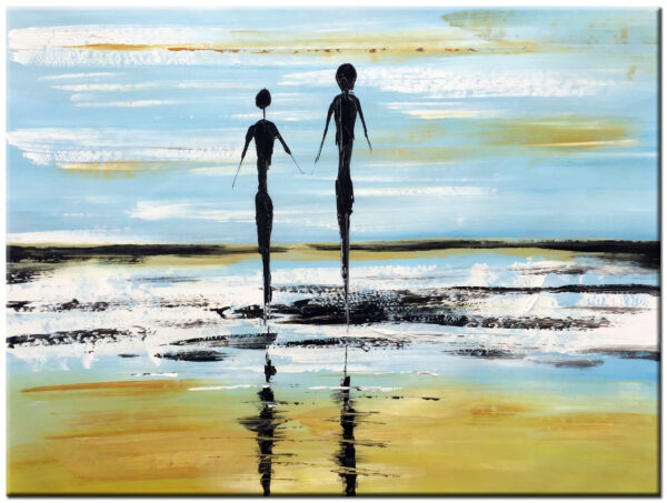 Strandwandeling modern schilderij toont een rustgevend tafereel van een stel of figuren wandelend langs de kust. De reflectie van het licht op het natte zand, het zachte kleurgebruik en de kalme horizon geven het werk een ontspannen en romantische sfeer. Dit schilderij vangt het gevoel van vrijheid en verbondenheid dat je ervaart tijdens een wandeling aan zee.