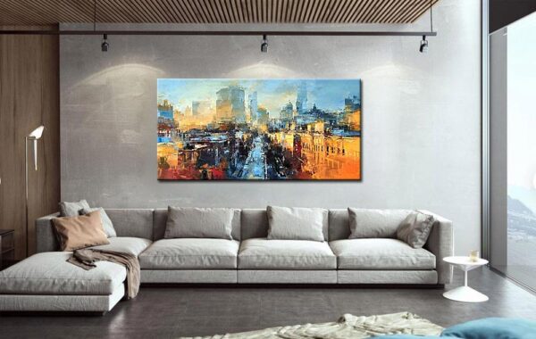 Streetview New York modern schilderij is een indrukwekkend Amerika kunstwerk op groot formaat dat de sfeer van een wereldstad op unieke wijze weet te vangen. De dynamische compositie toont een straatbeeld van New York, vaag geschilderd in warme oranje- en bruintinten, gecombineerd met koele blauwe accenten. Deze bijzondere kleurenmix geeft het schilderij een levendige, stedelijke uitstraling met een vleugje mysterie.