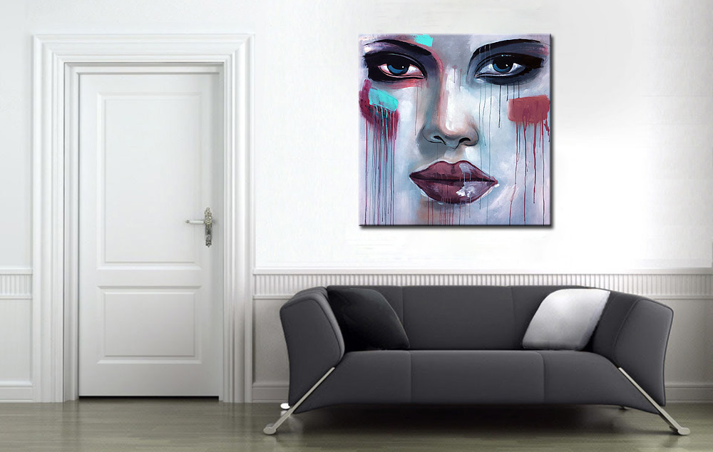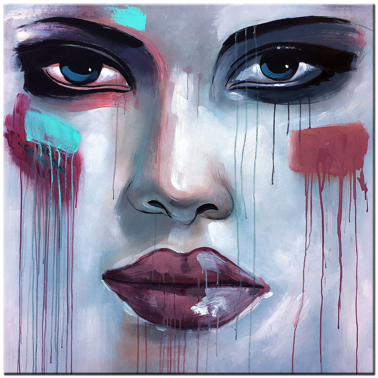 Dit Vrouwen schilderij Gezicht in Emotie is een krachtig portret dat gevoelens en expressie centraal stelt. Het figuratief schilderij toont een vrouwengezicht dat met intense penseelstreken en sprekende kleuren tot leven komt. De druppelende verf en contrasterende tinten geven het kunstwerk een moderne uitstraling, terwijl de klassieke olieverftechniek zorgt voor diepte en rijke nuances.