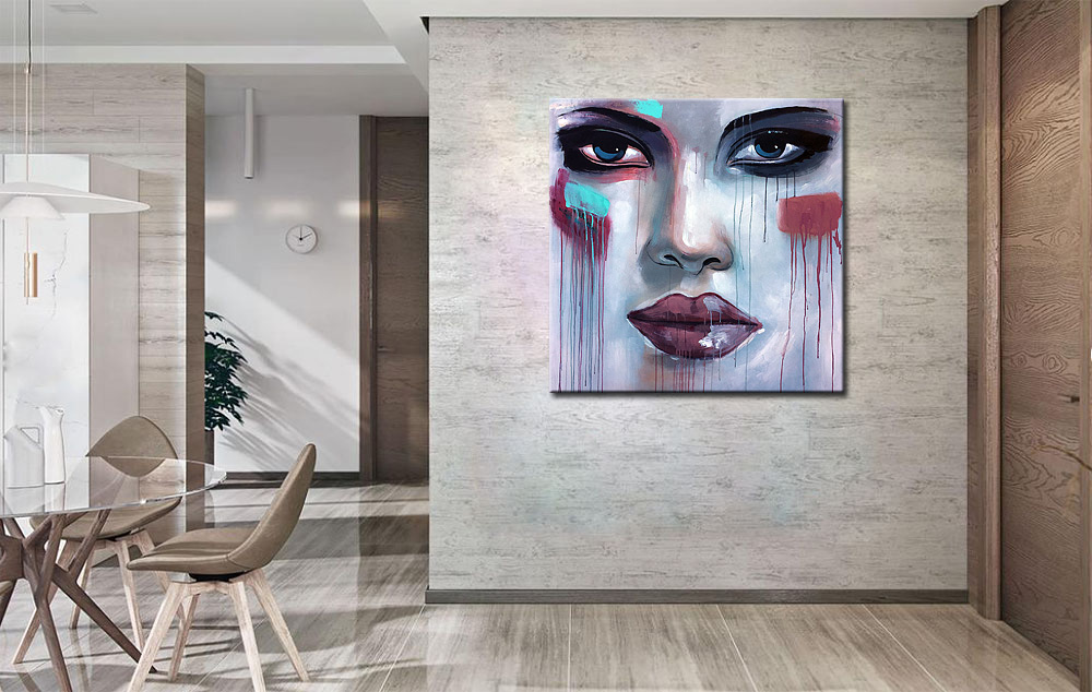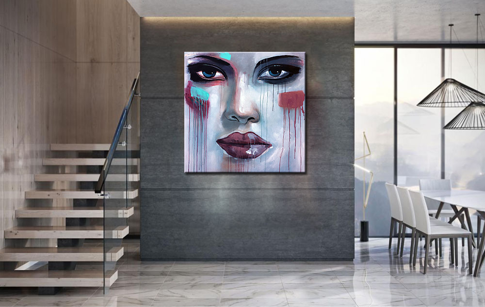 De kunstenaar speelt met tinten blauw, rood, paars en wit, die vloeiend in elkaar overlopen en tegelijk scherp contrasteren. Hierdoor ontstaat een spanning tussen kracht en kwetsbaarheid, waardoor dit schilderij blijft intrigeren. De expressieve ogen en de verfstructuur trekken direct de aandacht en brengen een emotionele lading over die in elke ruimte voelbaar is.
