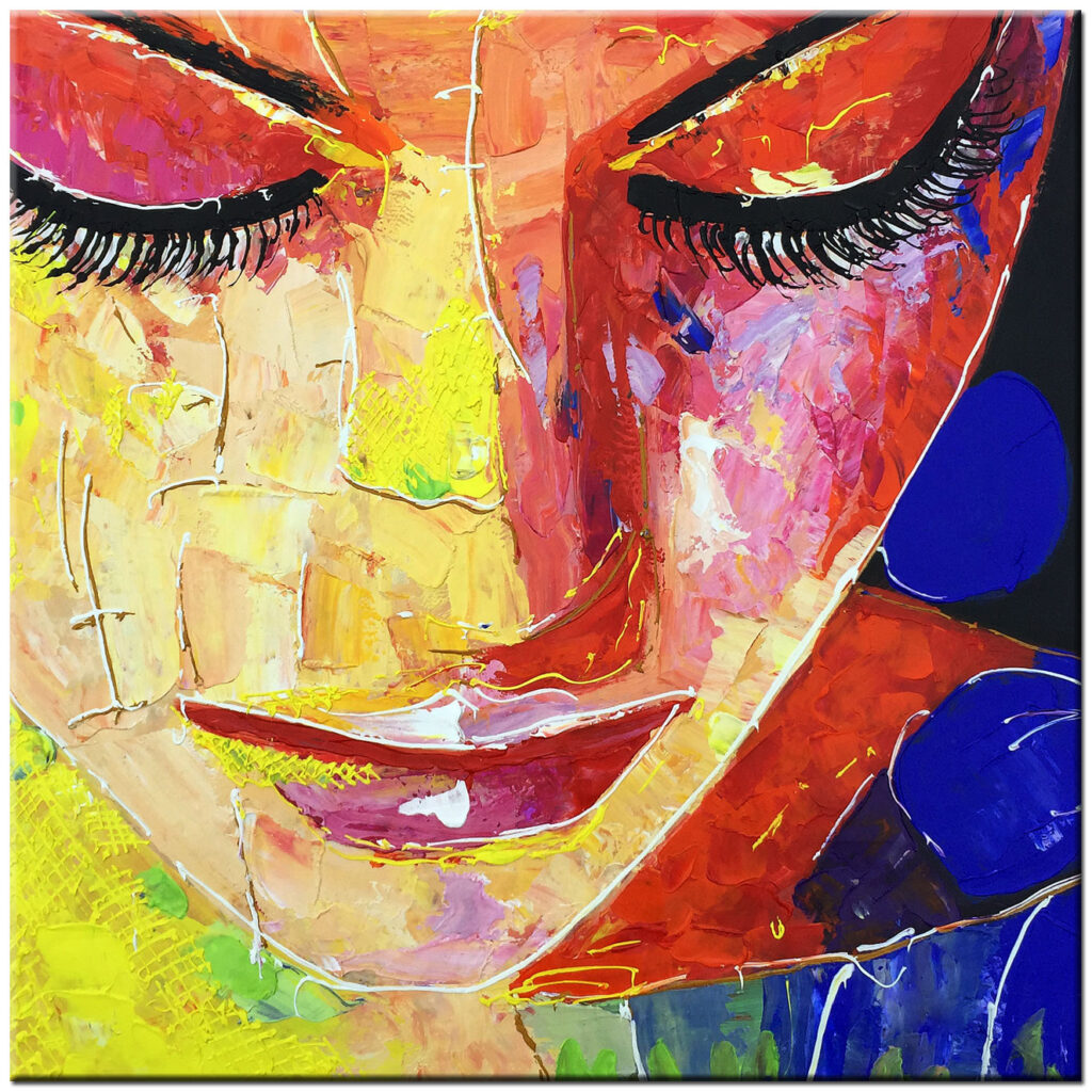 Dit kleurrijk portret schilderij laat zien hoe kunst emoties kan overbrengen met een mix van figuratie en abstractie. De gelaagde penseelstreken creëren een dynamisch geheel waarin steeds nieuwe details te ontdekken zijn. Het contrast tussen de donkere contouren van het gezicht en de heldere kleuren op de achtergrond versterkt de expressiviteit en geeft het schilderij een moderne uitstraling.