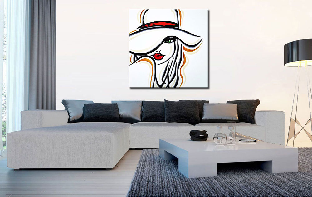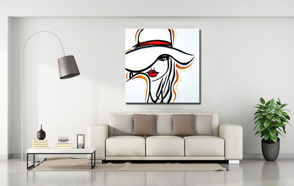 Het modern vrouwen schilderij past uitstekend bij liefhebbers van minimalistische kunst waarin kleine details een grote impact hebben. De rode lippen zijn een krachtig symbool van schoonheid en zelfvertrouwen, terwijl de grote hoed een vleugje mysterie toevoegt. De olieverftechniek geeft het schilderij diepte en een zachte glans die het werk extra allure verleent.